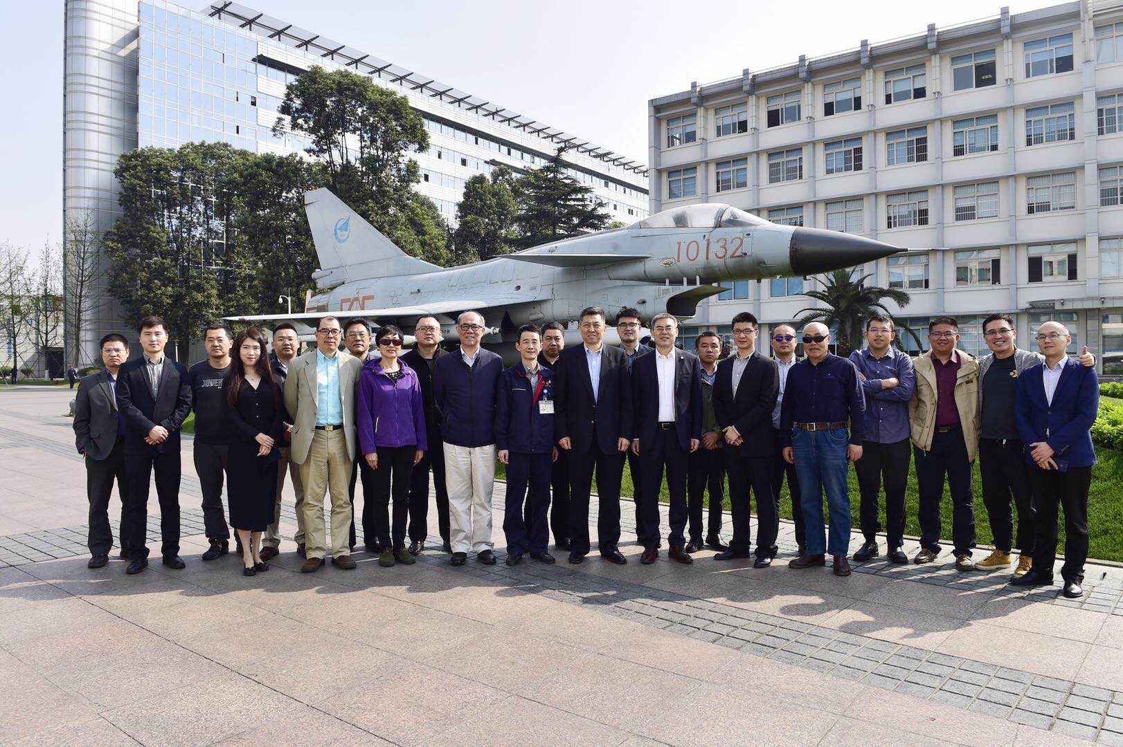 代表們與成飛領導在J-10戰鷹前合影